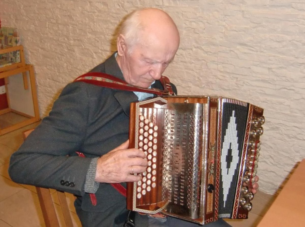 Just genau an seinem 91. Geburtstag kam der ehemalige Landwirt und Musikant Johann Hirtl aus Oberstrahlbach mit seiner Familie zum "Klingenden Wochenteilen" nach Sallingstadt und versuchte ein Stück auf der Steirischen von Reinhold Haderer. Leider war diese Harmonika für sein Können nicht abgestimmt und seine gewohnte Harmonika hatte er nicht dabei, aber vielleicht klappt es das nächste Mal.