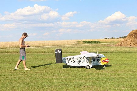 Ein Modell der Pink Skyvan, einem Absetzflugzeug, das im Original 20 Fallschirmspringer fasst, besuchte am Donnerstag, dem 16. Juli 2015, das Modellflugfeld in Sallingstadt, um hier eine Flugvorführung zu bieten.